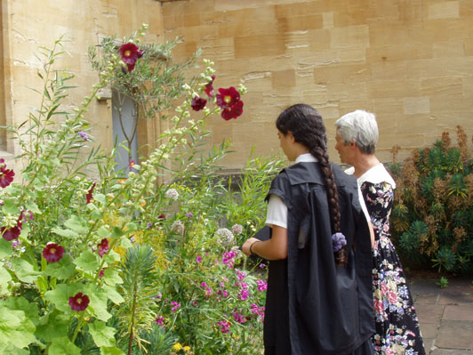 ![]() My mother and I admiring David Leek's lovely hollyhock-and-spurge plantings. |